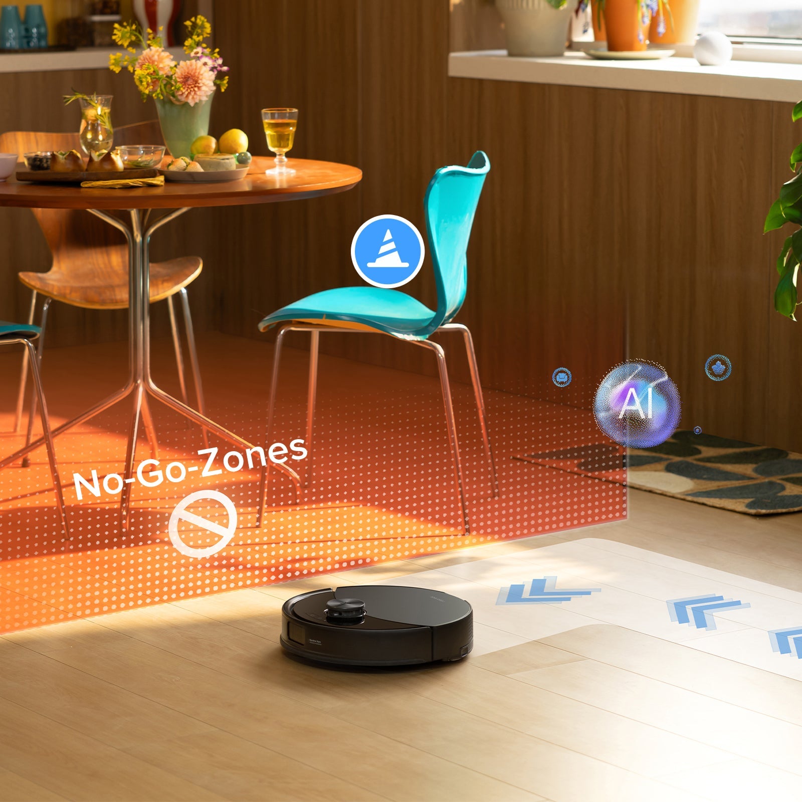 Avoid interruptions with smart navigation that detects tricky spots—like under chairs and tables—and automatically suggests No-Go Zones to keep cleaning seamless.