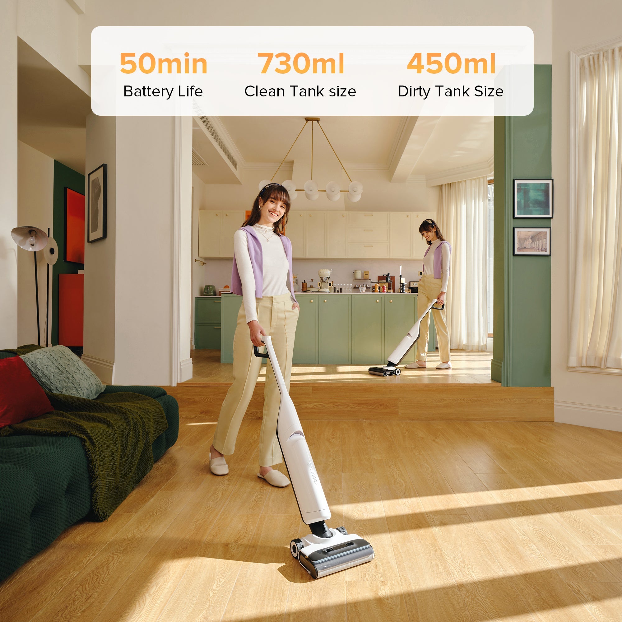 With a substantial 50 min* battery life, it delivers prolonged cleaningsessions without interruption, enabling an extensive cleaning coverage(420 sqm/4520 sqft* ) before requiring recharging.