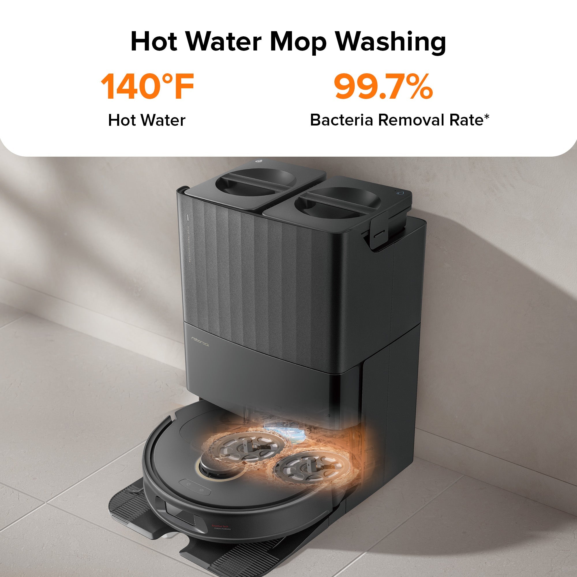 *Based on testing carried out by TÜV Rheinland on Staphylococcus aureus and Escherichia coli under default self-cleaning mode, over 99.7% of bacteria on the spinning mops are effectively removed.