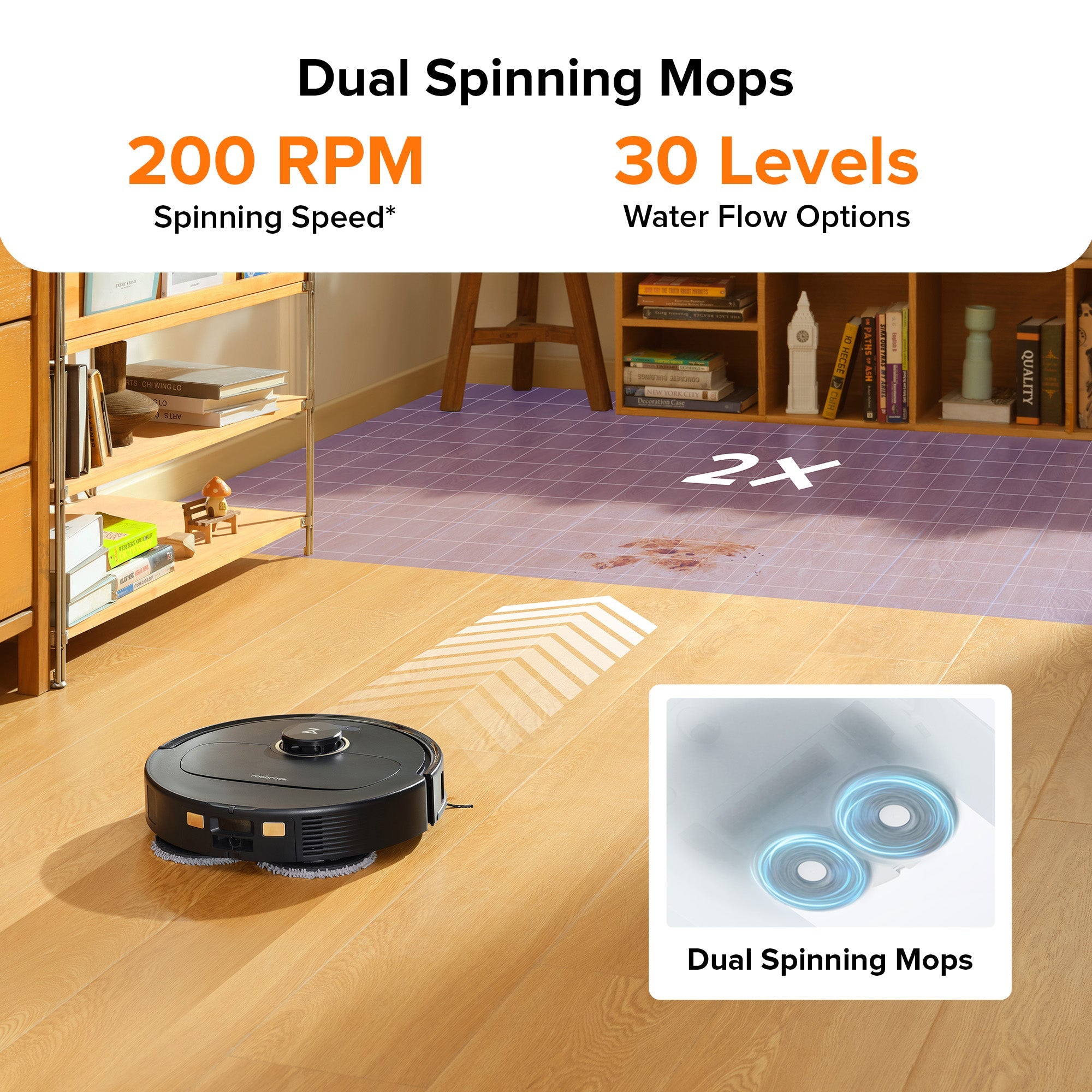 *Based on internal testing carried out by the manufacturer, when selecting extreme water flow in custom mode, the mops can spin atmaximum speed of 200 RPM.