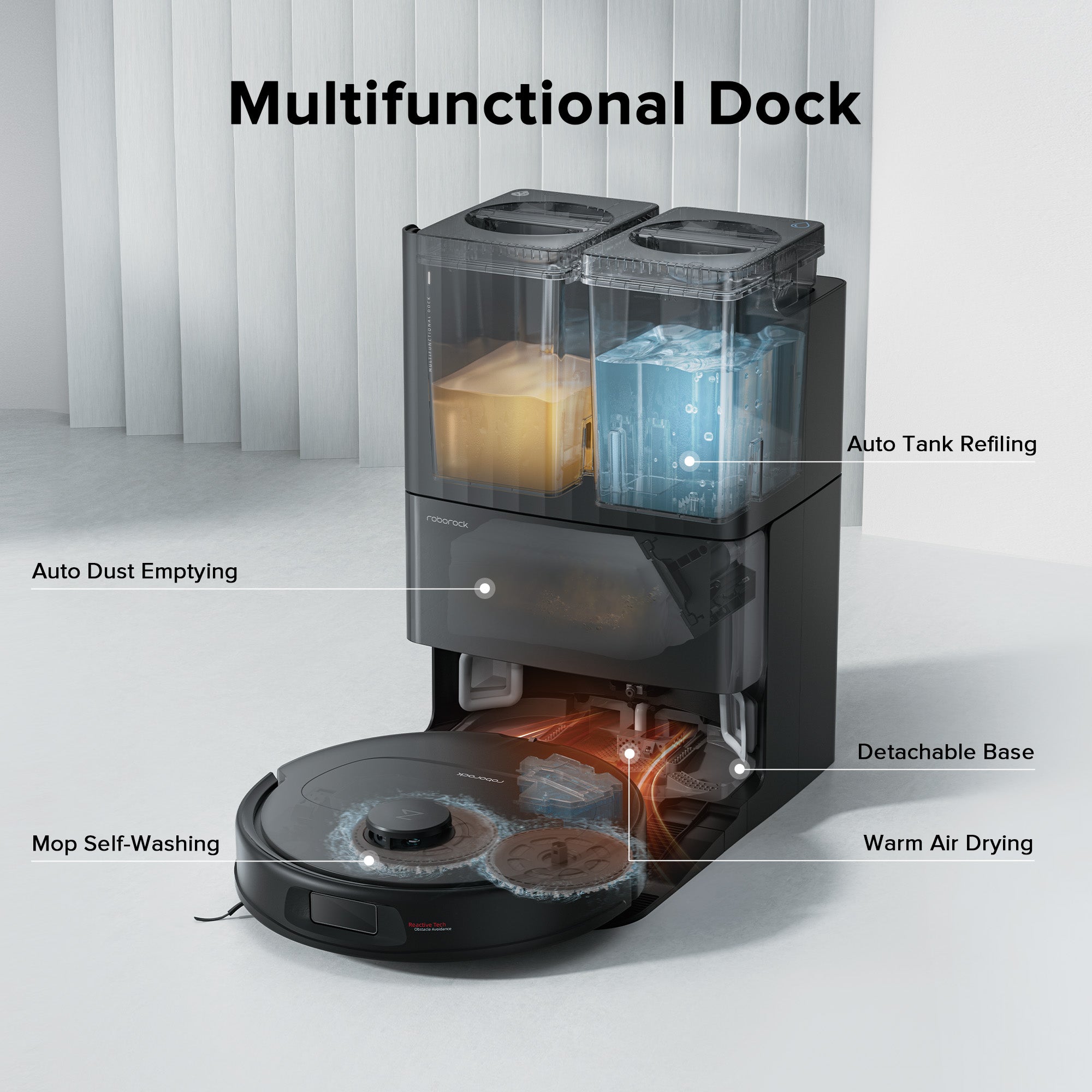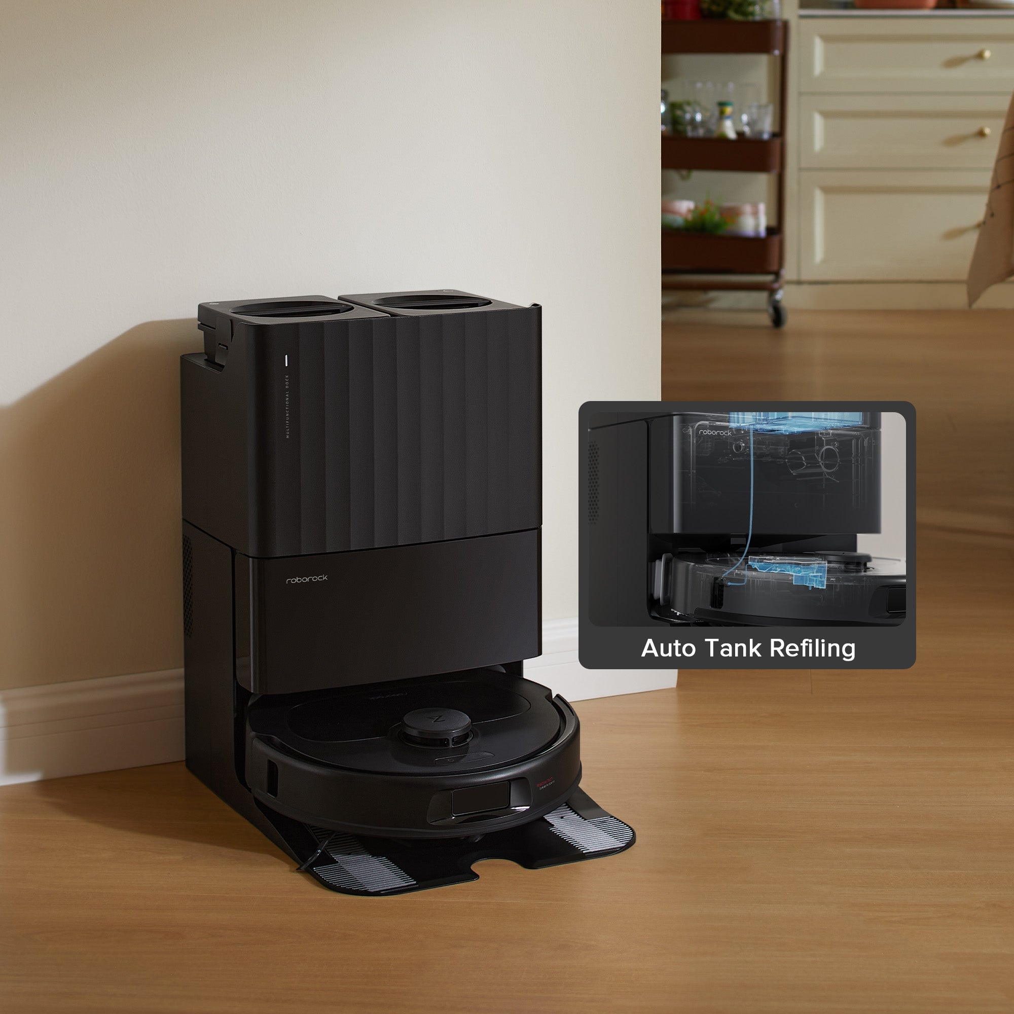 The multifunctional dock refills the robot water tank automatically during cleanup whenever the water level is low. It can mop up to 3552 sqft* before you need to fill the clear water tank manually.